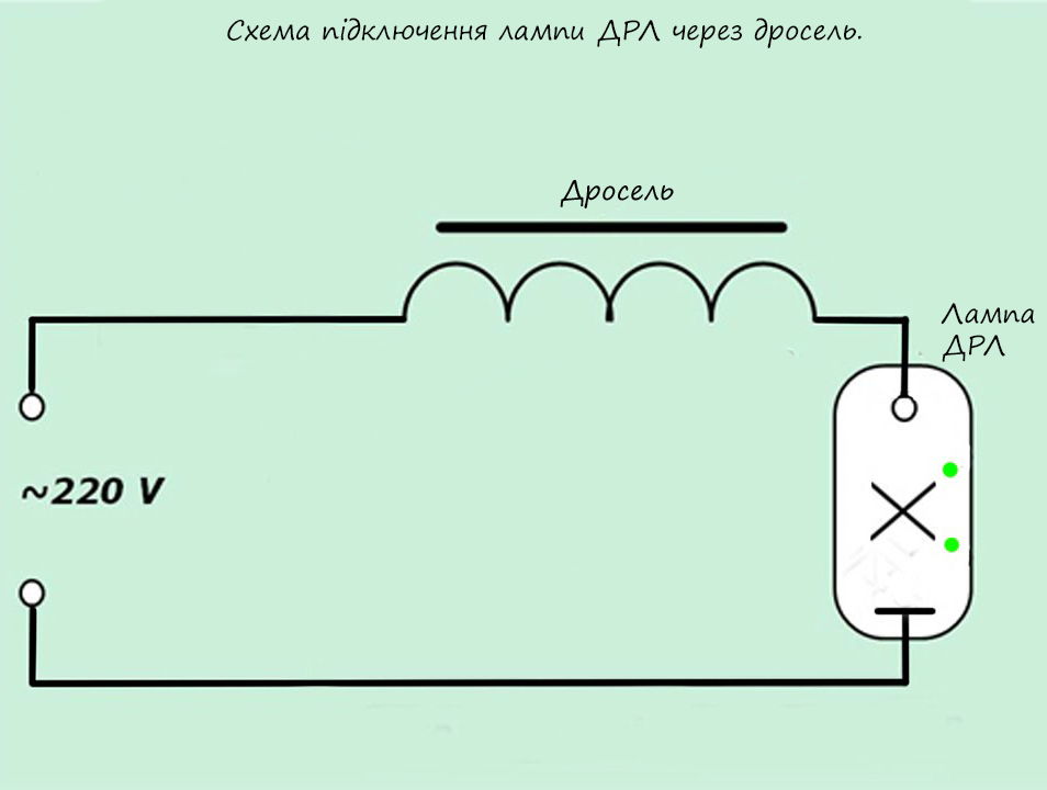 Схема запуску дугової ртутної люмінесцентної лампи (ДРЛ) за допомогою дроселя: